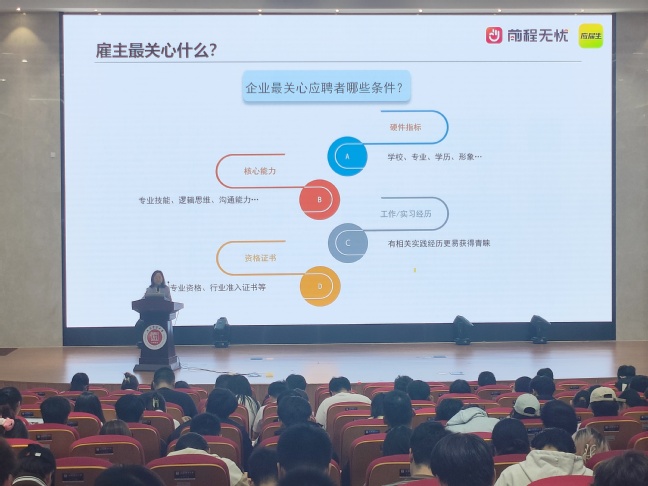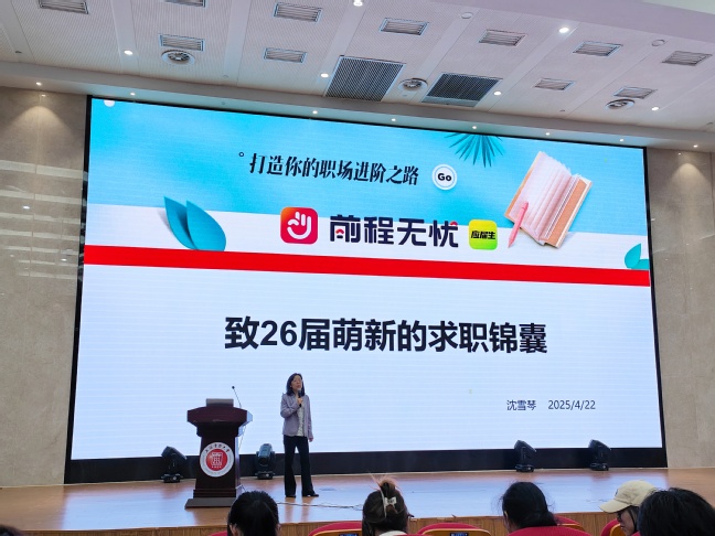 为助力2026届毕业生提前锚定职业方向,掌握校招实战技巧,4月22日下午,太阳成集团tyc234cc在学术楼117报告厅举办《老员工就业与创业实务》课程系列讲座之“26届校招萌新就业锦囊”专题指导会。本次活动特邀浙江大学管理学硕士、GCDF(全球职业生涯规划师)沈雪琴担任主讲嘉宾,公司2022级全体员工参与,活动由辅导员展晴晴主持。