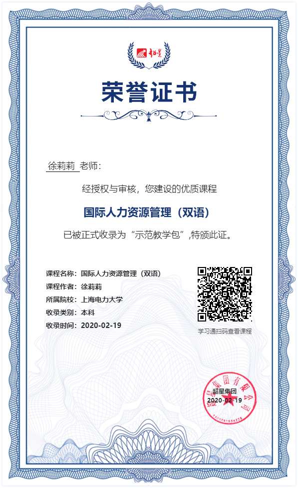 徐莉莉老师是公司第一批线上课程的建设者和参与者,也是混合教学模式的探索者。她主讲的《国际人力资源管理(英)》是公司第一批慕课课程建设项目,于2019年签约超星学银在线教学示范包(公益)。徐莉莉老师凭借深厚的教学功底、丰富的线上教学经验,荣获上海市首届移动教学大赛一等奖。