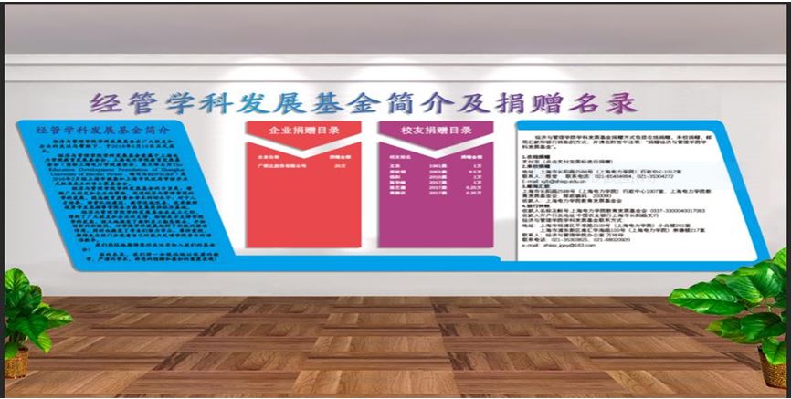 (图为临港新校区太阳成集团tyc234cc大楼“经管学科发展基金简介及捐赠名录”墙效果图)