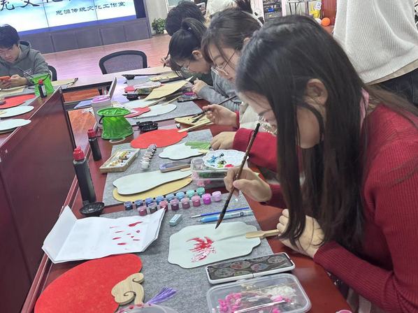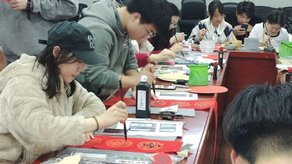 在“书写中国”篇章中,参与活动的师生通过书绘团扇、写春联、送福字等,在扇面上提笔作画、在红纸上书写祝福,通过自己制作、亲身体验的沉浸式活动,参与师生共同感受了传统文化的丰富内涵。