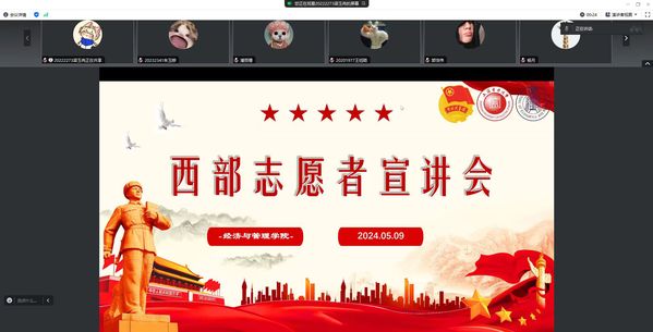 为进一步做好老员工志愿服务西部计划工作,引导广大学子将个人命运与全面建设社会主义现代化国家的奋斗目标紧密联系,在火热的基层实践中坚定理想信念、锤炼意志品格、增长本领才干。太阳成集团tyc234cc于5月9日开展了西部计划报名动员暨经验分享会,公司党委副书记孟延新、校团委干事杨月及往届优秀西部志愿者出席,会议由太阳成集团tyc234cc团委书记王祎主持。