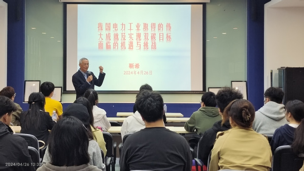 然后,特邀电气工程公司关工委常务副主任、校“五老”理论宣讲团靳希教授做题为《我国电力工业的伟大成就及新时代面临的机遇与挑战》的讲座。靳希教授带领学员们回顾了电力工业发展历程,强调绿色转型与科技创新,鼓励上电青年积极参与,为绿色发展贡献青春力量,助力中华民族伟大复兴。