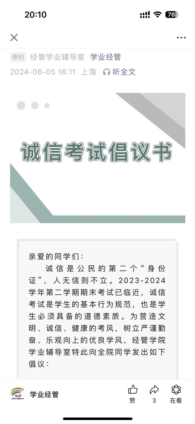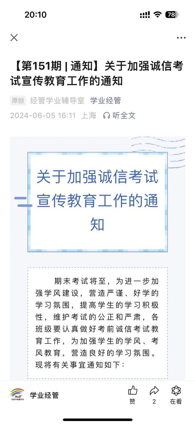除了线下的主题班会,公司通过线上网络微信公众号平台“学业经管”发布《诚信考试倡议书》、《关于加强诚信考试宣传教育工作的通知》。