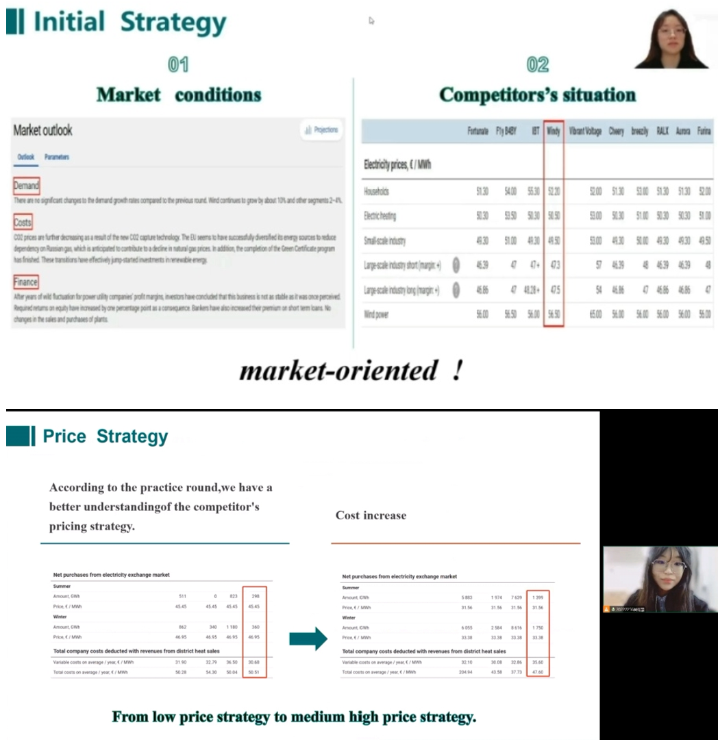 决赛阶段主要通过视频成果展示和云答辩介绍参赛项目,评委专家通过市场数据、商业决策、团队展示等对队伍进行考核。公司Windy团队在各方面展现出了卓越的实力,从校内赛中脱颖而出。她们始终坚持以市场为导向,凭借敏锐的洞察力深入分析市场趋势,并根据市场动态灵活调整定价策略,从而成功提升了市场占有率。与此同时,团队积极顺应市场和政策,致力于提高清洁能源的占比,为推动可持续发展做出了积极贡献。在比赛中,她们扎实的数据支撑、对市场局势的出色把控能力,以及在展示与答辩中所展现出的严谨条理性,共同构成了本次比赛的一大亮点。