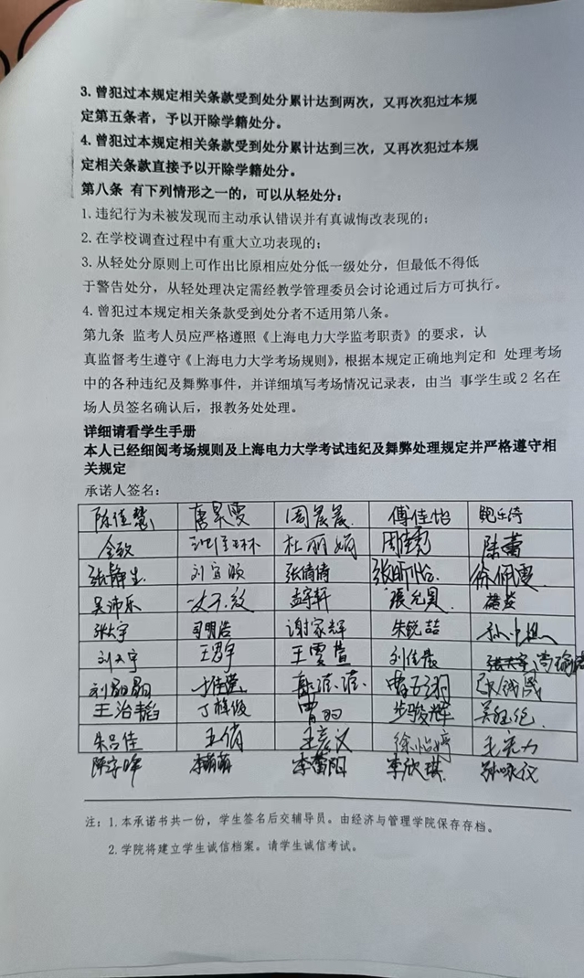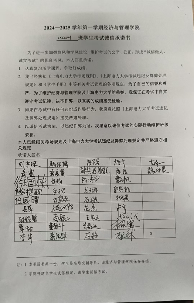 太阳成集团tyc234cc所有班级通过年级QQ群、班级群等网络媒介,在考前进行考试纪律和警示教育。同时安排班长、学习委员等班委、员工党员与班级员工进行诚信结对,进行诚信考试宣传和监督。所有班级全覆盖签署了考试诚信承诺书。
