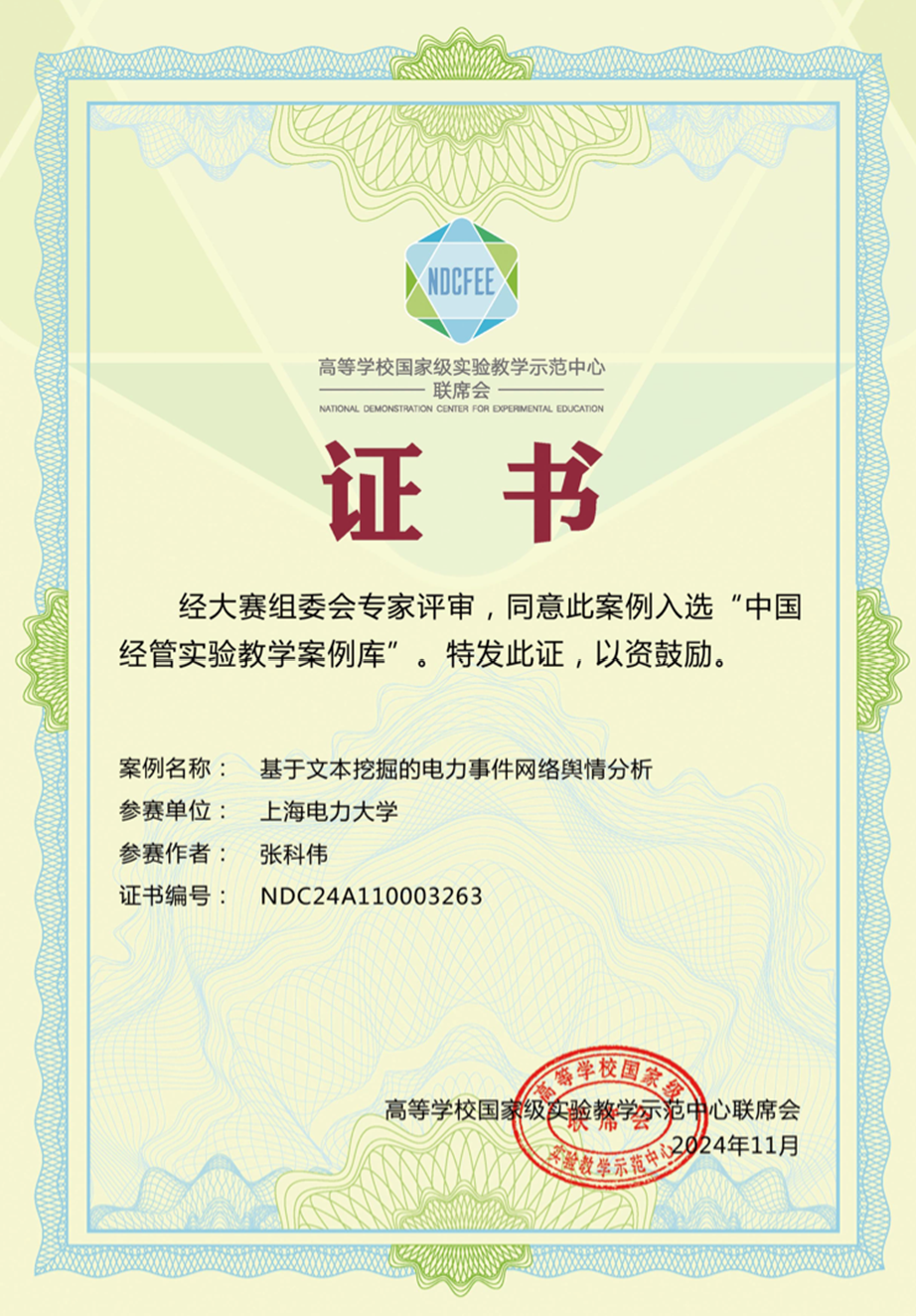2024年9月21日,第七届“智享杯”全国高校经管类实验教学案例大赛华东区决赛在上海财经大学举办。公司管理科学与工程系张科伟教师撰写的《基于文本挖掘的电力事件网络舆情分析》实验教学案例荣获三等奖,并于11月成功入选中国经管实验教学案例库。